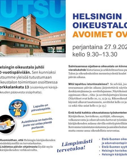Helsingin oikeustalo juhlii 20-vuotispäiviään. Sen kunniaksi kutsutaan yleisöä tutustumaan oikeustalon toimintaan kello 9.30–13.30 osoitteessa Porkkalankatu 13 (sisäänkäynti käräjäoikeuden pääovesta sisäpihalta). Mitä istuntosaleissa tapahtuu, se selviää, jos menee seuraamaan päivän aikana järjestettäviä näytösoikeudenkäyntejä ja -sovitteluja. Näytöksissä pääsee oppimaan rikos-, riita- ja sovittelujuttujen kiemuroista. (Näytökset ovat kello 10, 11, 12 ja 13. Rikosoikeudenkäynnit alkavat tasatunnein, sovittelut kello …