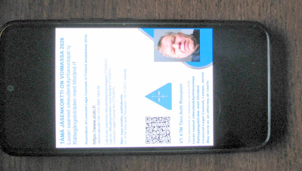 Kortin voi näyttää puhelimestakin. Luvan voimassaolon voi tarkastaa nopeasti qr-koodin avulla. Omassa kortissamme qr-koodi on ollut jo vuosia. Sen avulla pääsee asianomaista henkilöä koskevalle sivulle OM:n luparekisterissä. Jos lupaa ei ole, sivulla näkyy ilmoitus ei tietoja.