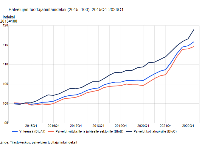 Palveluiden tuottajahintaindeksi (2010=100) oli lakiasiainpalveluiden kohdalla vuonna 2014 tasolla 107,2. Indeksi uudistui vuonna 2015 (=100) ja vuonna 2022 tuo uudistettu indeksi oli tasolla 120,7.