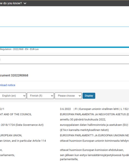 EU:n asetuksia, jotka ovat suoraan sovellettavaa oikeutta toisin kuin direktiivit: EU:n datastrategia https://eur-lex.europa.eu/legal-content/EN-FI/TXT/?from=EN&uri=CELEX%3A52020DC0066 EU:n datanhallinta-asetus https://eur-lex.europa.eu/legal-content/EN-FI/TXT/?from=EN&uri=CELEX%3A32022R0868 EU:n datasäädös https://eur-lex.europa.eu/legal-content/EN-FI/TXT/?from=EN&uri=CELEX%3A32023R2854 saa näkyviin rinnakkaisteksteinä esim englanti – suomi